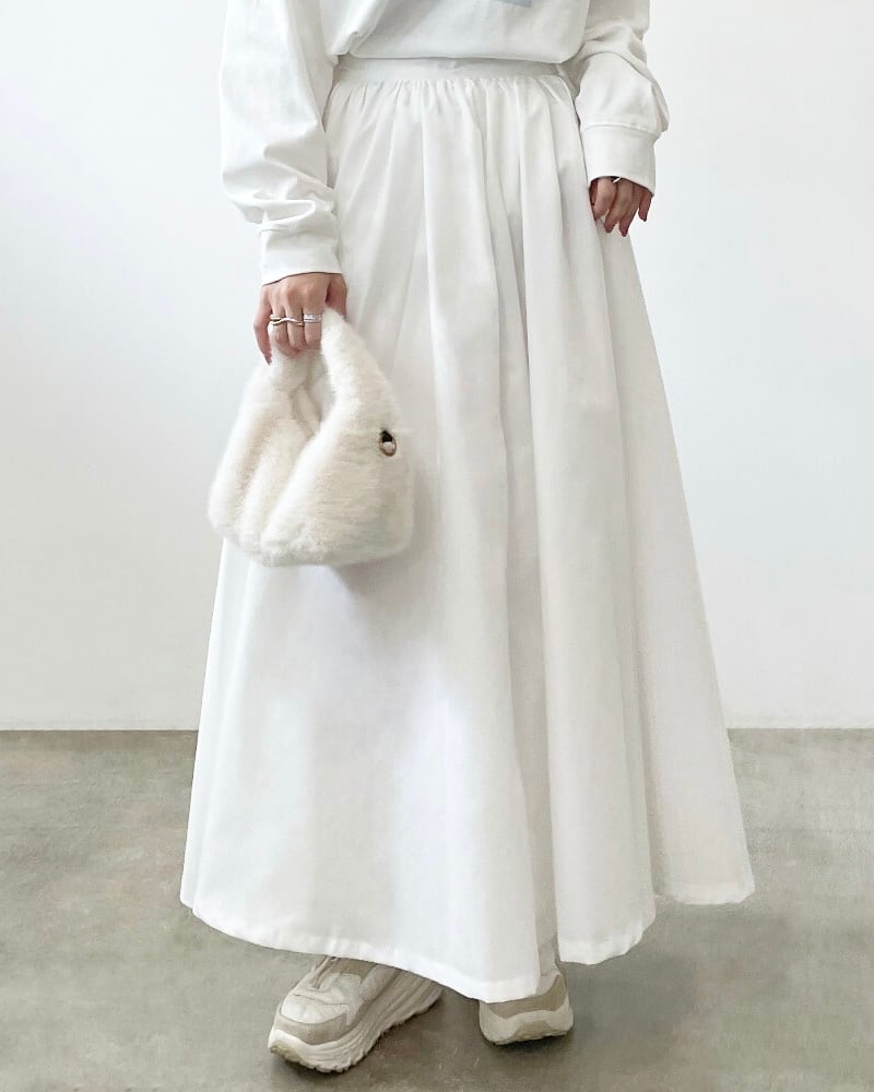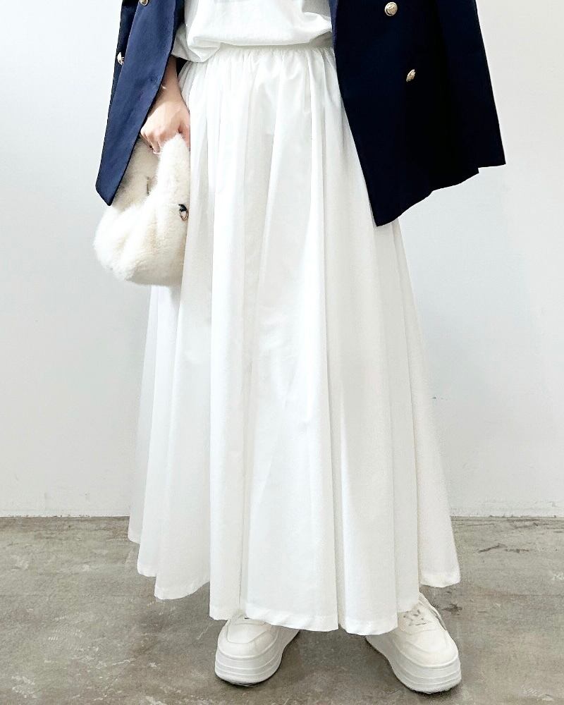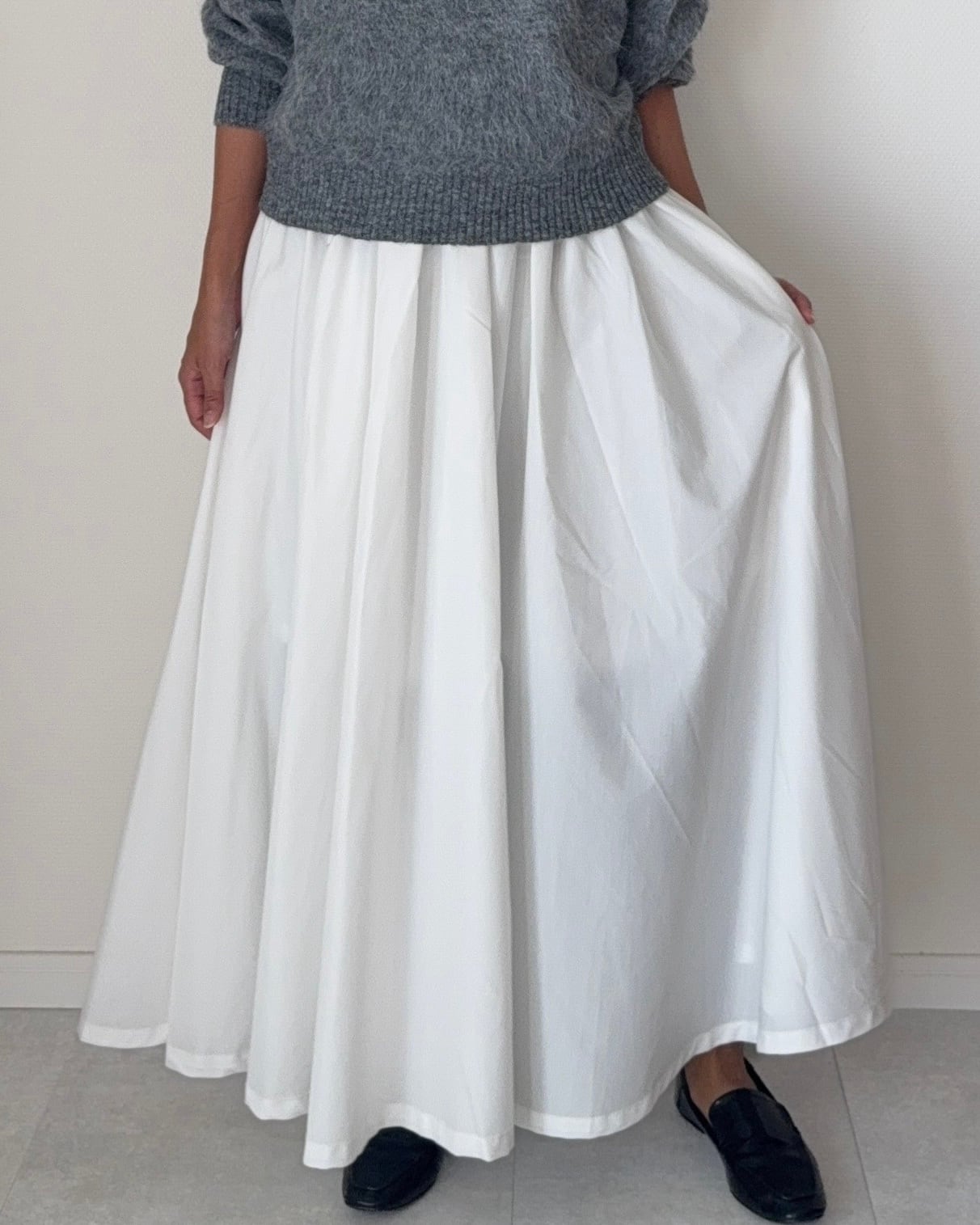 着こなしの幅が広がる、ふんわり美シルエットのスカート◎ハリ感のあるブロード素材で動くたびに上品な印象に。きれいめでも、カジュアルでも着回し万能なアイテムです